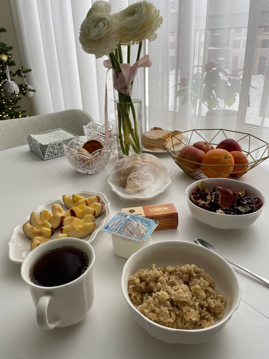 Сегодня утренний прием пищи начался с ароматной овсянки, к которой были добавлены нежный творог и сочные кусочки яблока. Завершил завтрак маленький сырок, придающий дополнительно энергии на весь день.