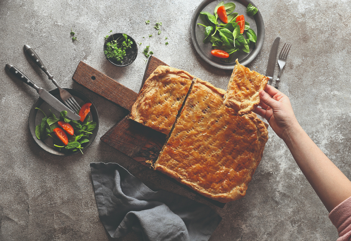 Пирог из слоёного теста с горбушей, пореем и пармезаном