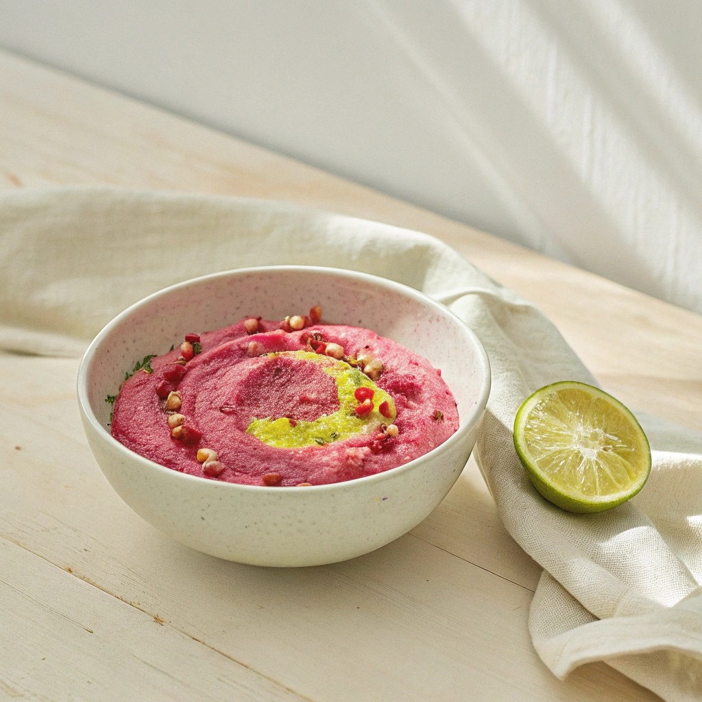 - Хумус из свёклы с йогуртом на лайме — удивительное сочетание сладости свёклы и кислоты лайма, которое перевернёт ваше представление о закусках. Несмотря на непривычный цвет покрытия, это блюдо станет настоящим хитом.