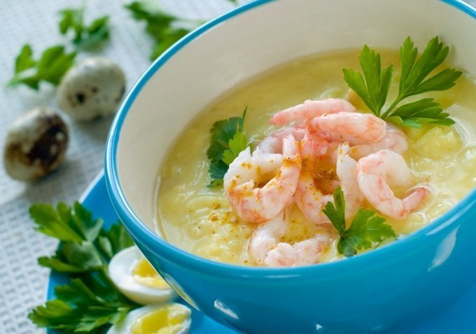 Подкорректируйте вкус с помощью соли и специй, добавьте свежую зелень. В конце положите креветки и прогрейте суп 1-2 минуты. Готовый суп можно улучшить, добавив куркуму для яркого желтого оттенка.